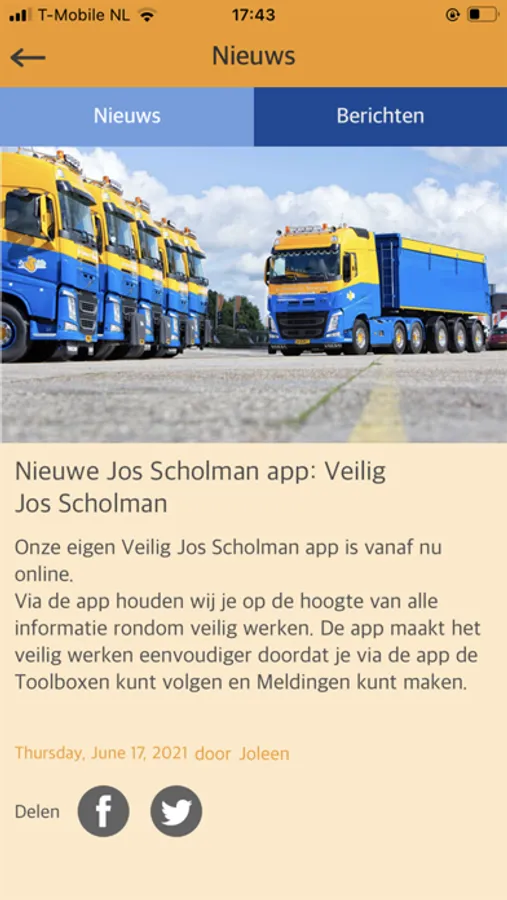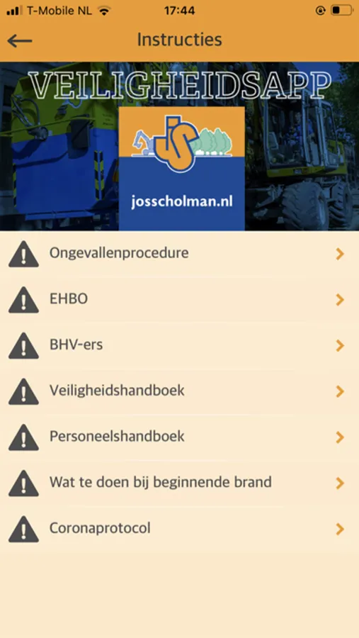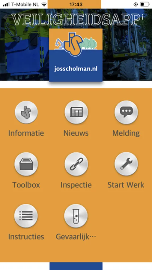Dit is de app Veilig Jos Scholman. Hierin worden eenvoudig meldingen gemaakt van onveilige situaties en werkplekinspecties ingevuld. Regelmatig wordt er nieuwe informatie over veilig werken in deze app geplaatst.