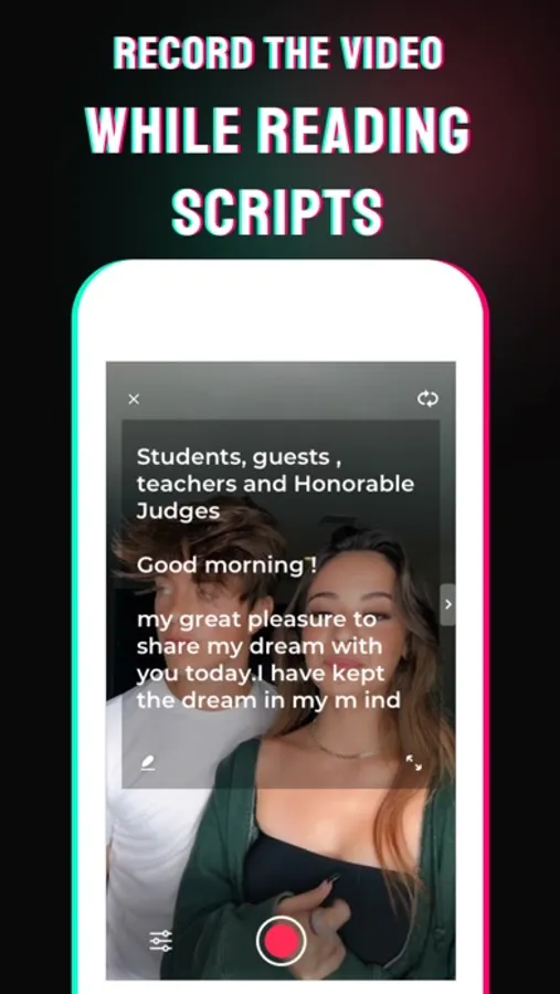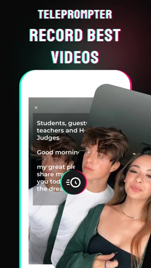 You read a pre-prepared script while recording yourself using the front/back-facing camera. Simply press record and read the script as it scrolls down the screen. As the script scrolls next to the camera lens, so you look like you're talking to your audience when you are actually reading!