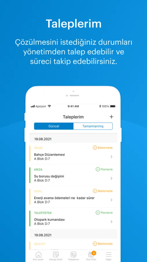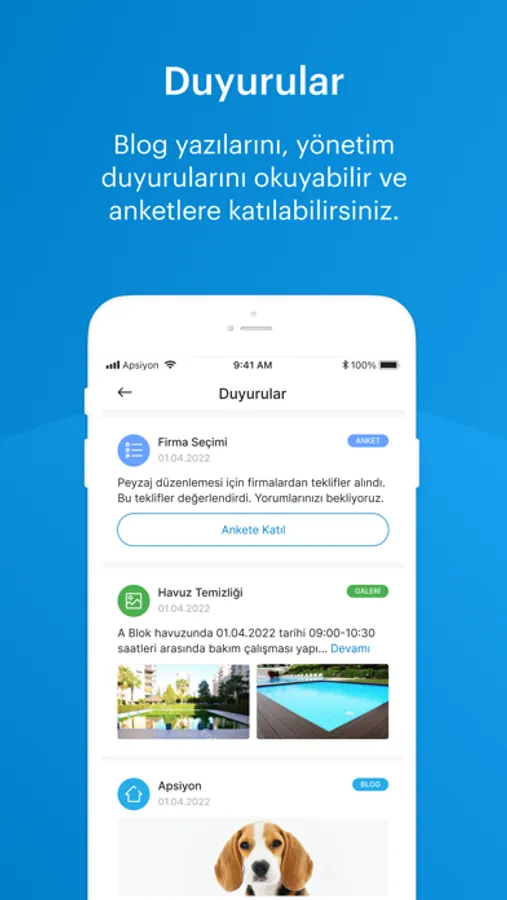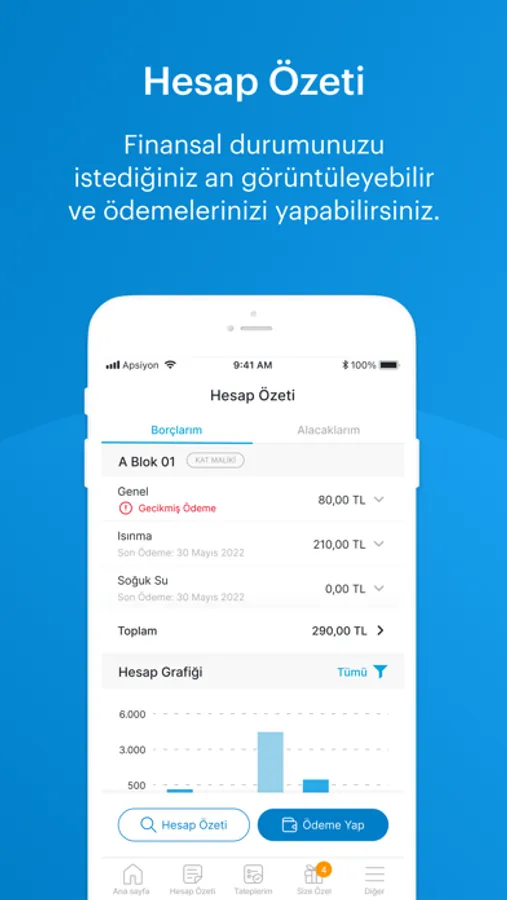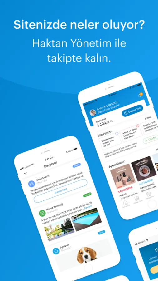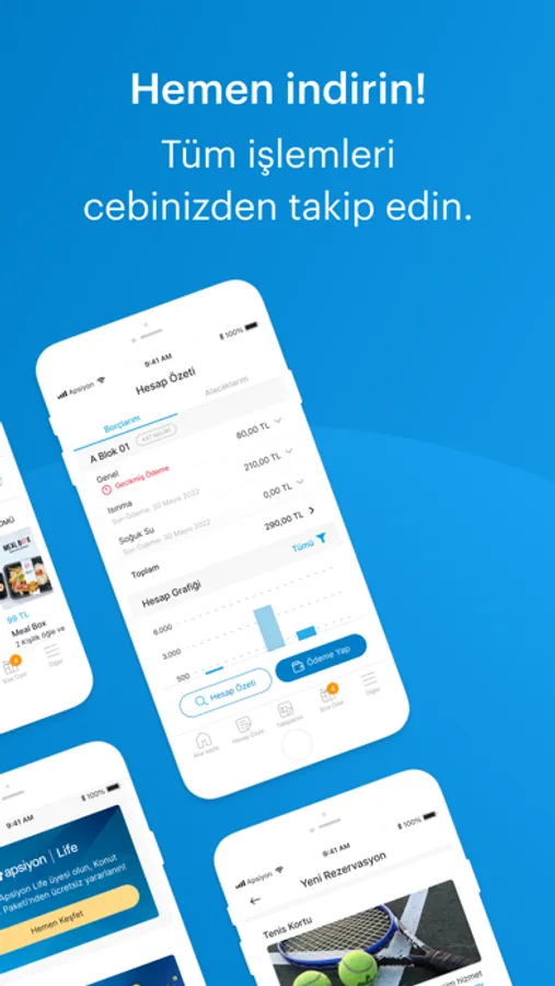 İstediğiniz zaman, istediğiniz yerde online gelir-gider, kasa-banka, duyuru-anket takiplerini ve online aidat ödeme işlemlerinizi uygulamamız üzerinden yapabilirsiniz.