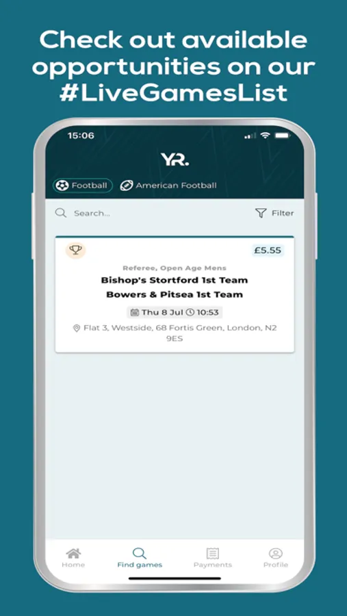 Receiving appointments, managing Availability, finding games and getting paid is now easier than ever. We bring the most relevant and local games straight to you through our #LiveGamesList. Accept and reject your appointments in one click. The YesRef App also lets you receive quick and secure digital payments, directly to your bank account, without the need to share your payment details with multiple organisations.