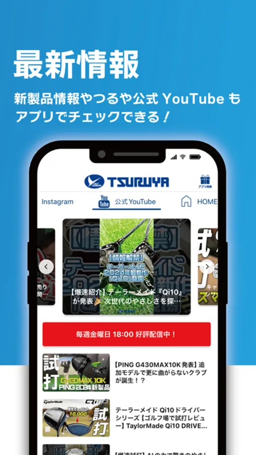 つるやゴルフで開催中のキャンペーンやポイントアップ情報、商品レビュー満載の「つるや公式YouTube」をご覧いただけます。また、プッシュ通知にてお手持ちのスマートフォンに最新情報をお届けします。