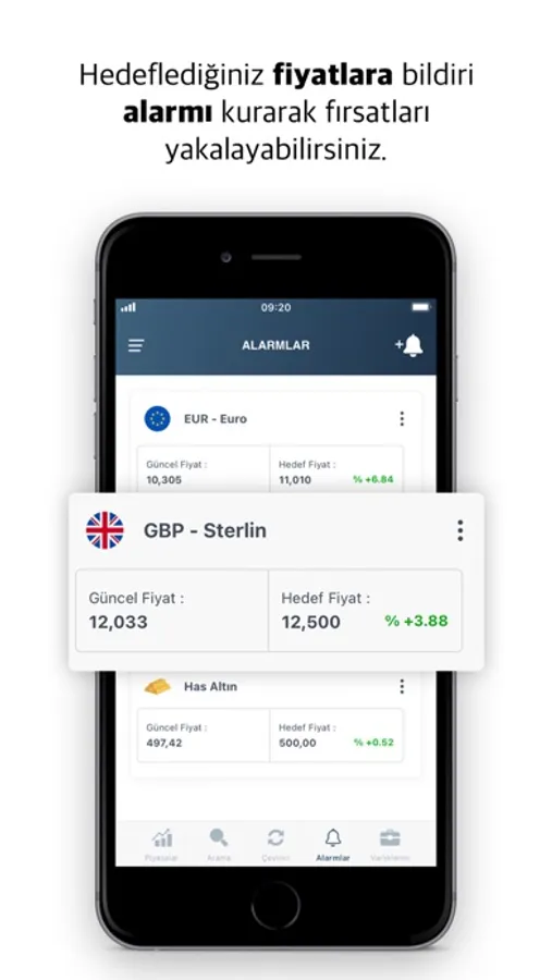 -Tüm altın ve döviz kurları için ister değere ister orana göre özel bildiri alarmı ile kullanıcılarını tercihleri doğrultusunda otomatik bilgilendiriyor.
