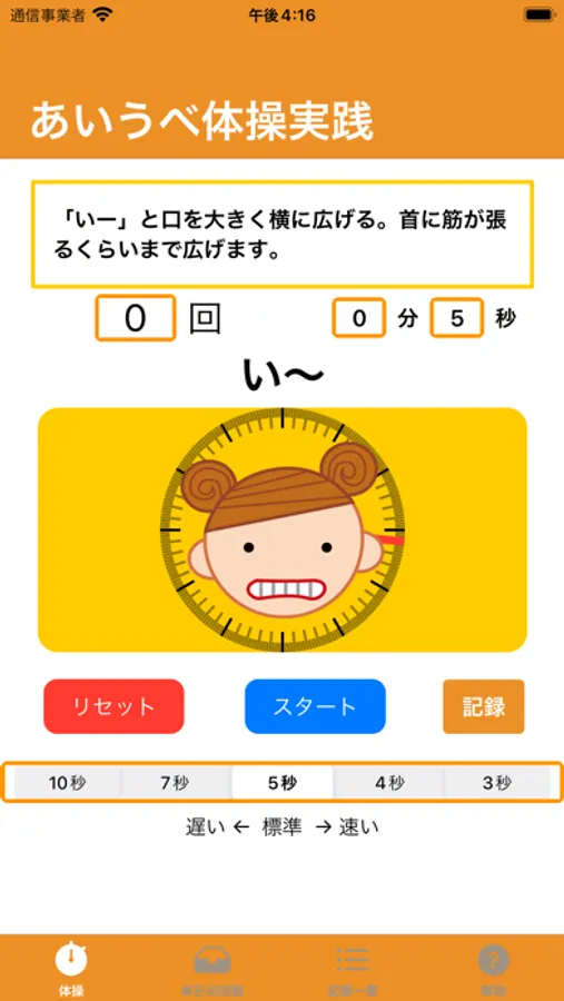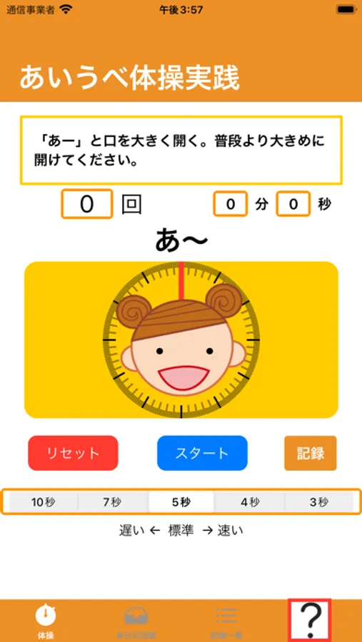 「あ~」「い~」「う~」「べ~」は標準で5秒で変わります。そのスピードを10秒、7秒、5秒、4秒、3秒に変えることができます。リセットボタンとスタートボタンの下のボタンを選択することで変更できます。スピードの変更に合わせて回数や経過時間も変更になります。この体操を始めて、当分の間は標準の5秒で実践することをお勧めします。将来必要に応じてスピードの変更を使ってください。