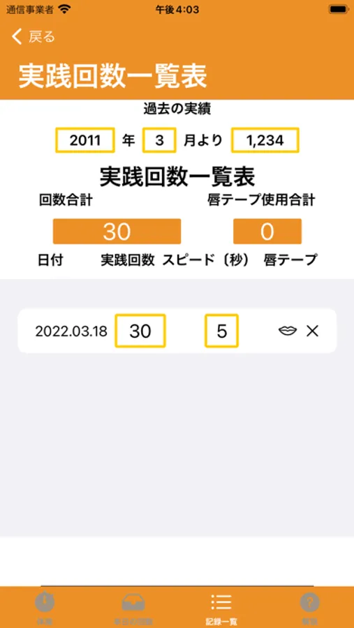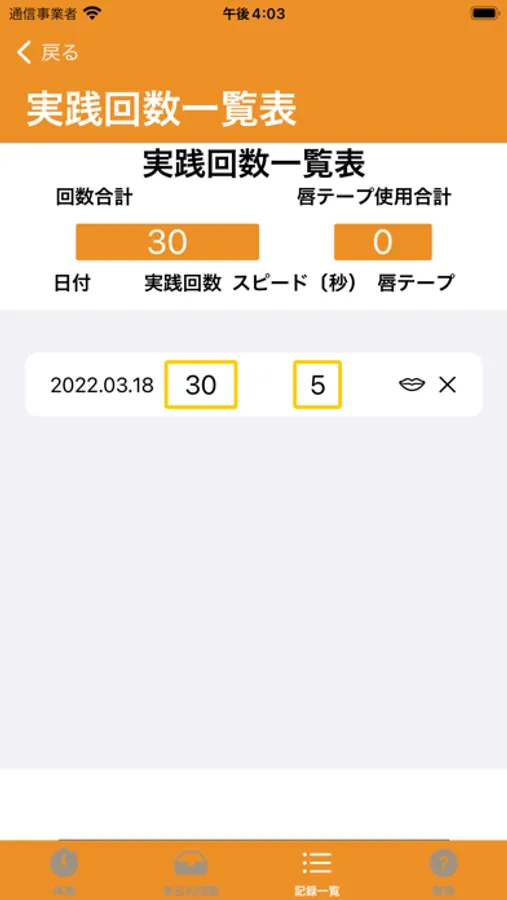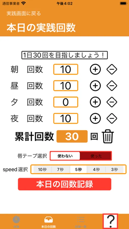 一日の実践が終わり、実践回数と唇テープの使用有無をインプットしたら、「本日の回数記録」ボタンを押して下さい。記録されて、一覧表に飛ぶようになっています。途中で押しても確認のアラートがでますので、間違ってインプットすることはありません。
