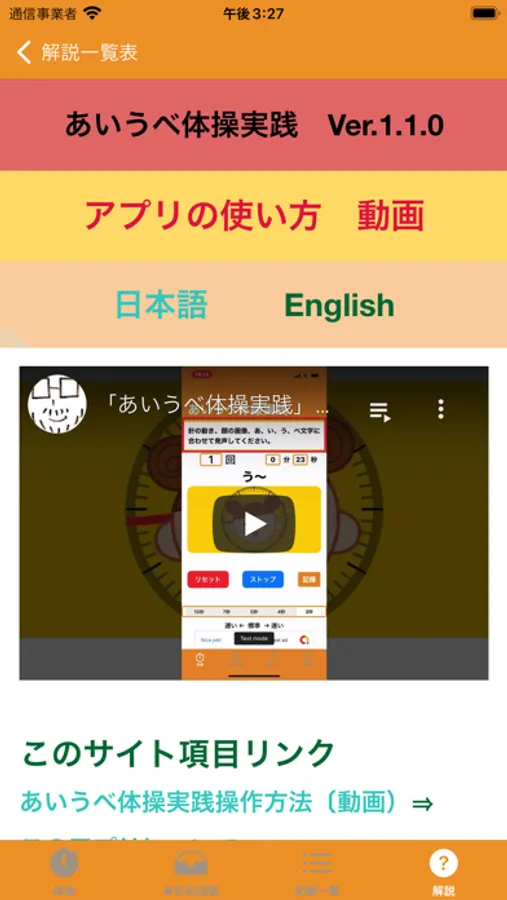 この機能は、正しい体操の方法を意外なほど忘れてしまうと実感して加えたものです。例えば「筋肉をしっかり動かせると効果も出やすいのでマンネリにならないよう意識しましょう。」という解説短文を載せましたが、私自身マンネリになって筋力トレーニングということを忘れて、形だけ「あ~」「い~」「う~」「べ~」を繰り返していた反省を込めたものです。