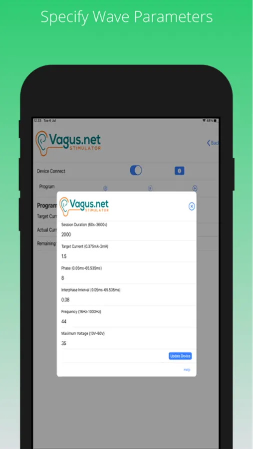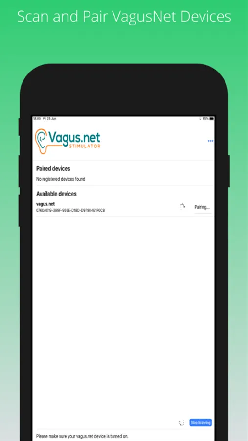 If you have a vagus.net research edition tVNS stimulator, you can use this app to connect to it via Bluetooth, configure all stimulation parameters -- frequency, wave form, intensity -- and start/stop stimulation. The latest version improves connection and stability and offers better control of intensity during stimulation and a set of advanced features to support double-blind, placebo controlled scientific studies.