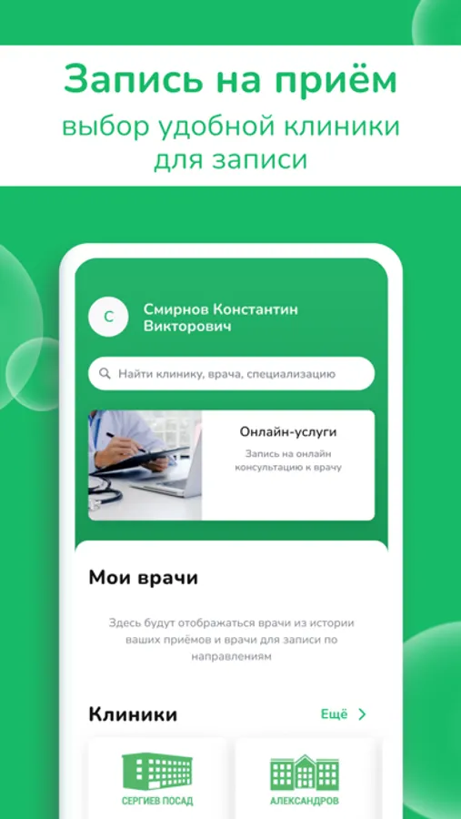 - Самостоятельно записаться на прием к врачу на очный прием в клинику в г. Сергиев Посад, г. Александров.