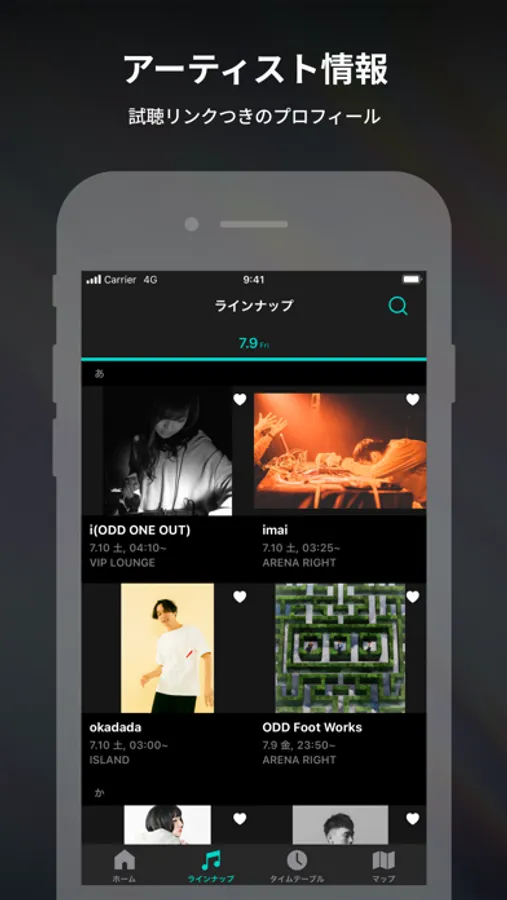 出演アーティストのラインナップを出演日別に確認できます。アーティストの詳細からはMVやApple Music、Spotifyなど各種ストリーミングサービスのリンクで楽曲のチェックができます。