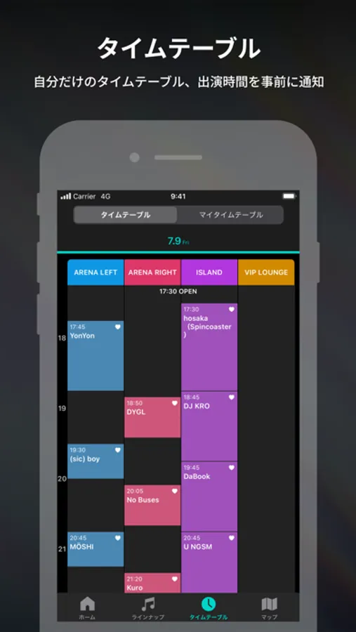 イベントのタイムテーブルを確認できます。マイタイムテーブルの作成や、出演時間が近づくと通知をしてくれる"リマインダー機能"も。マイタイムテーブルはSNSなどでシェアすることも可能です。
