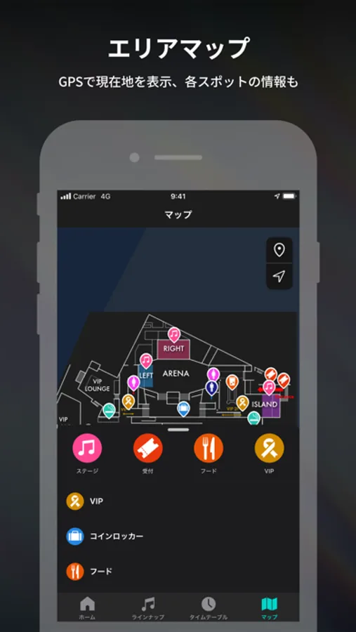 ステージやトイレ、各ブースの位置を目的に合わせて素早く確認できます。飲食店の情報もここからチェックできます。