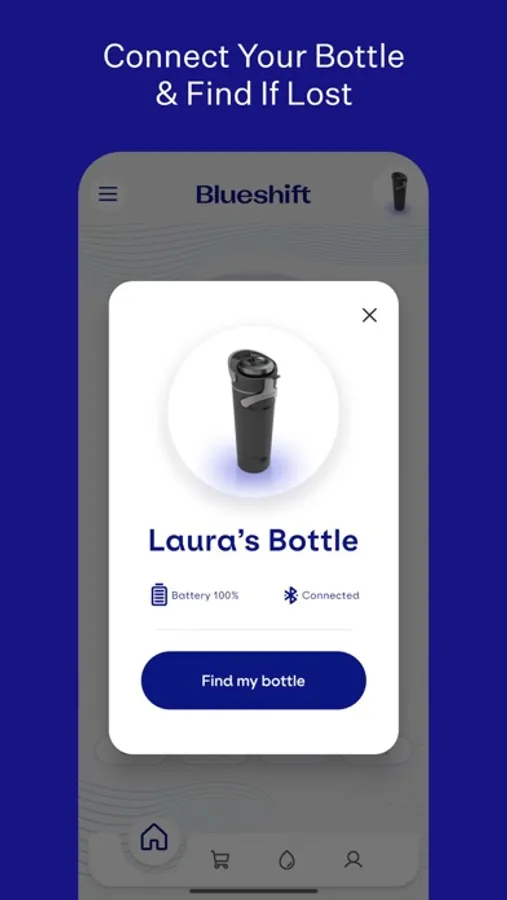 Shift water into wellness with the Blueshift Wellness Bottle app. The app connects to your Wellness Bottle as part of your personalized wellness experience. Not only can you track progress toward a personalized hydration goal, but you can customize your drink reminder, auto-blend, and light ring settings. It can even help you find your bottle if it's gone missing. Just download the app, create your profile, connect your Blueshift Wellness Bottle, and start sipping.