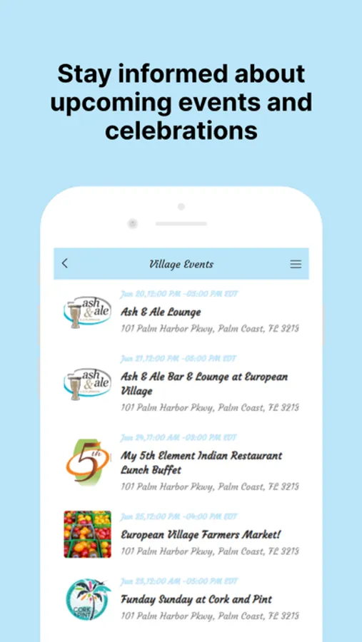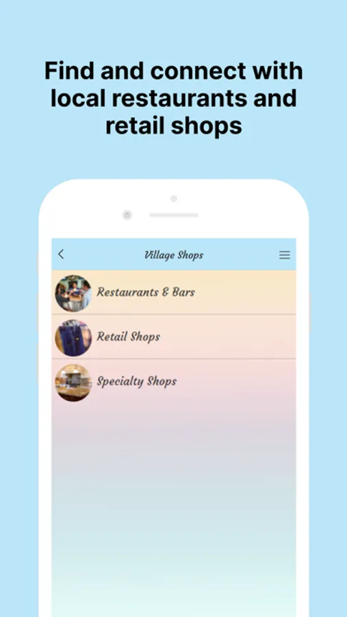Explore our Restaurants & Retail Shops using the Location feature with an easy click to call and get directions tab to the village, view each website, and send messages if you have questions. Other features include Our Events and Live Entertainment tab including our weekly Farmers Market Halloween, St. Patrick's Day, and New Year's Eve Celebrations, and to see what's being planned so you never miss any of the exciting events on the village schedule.