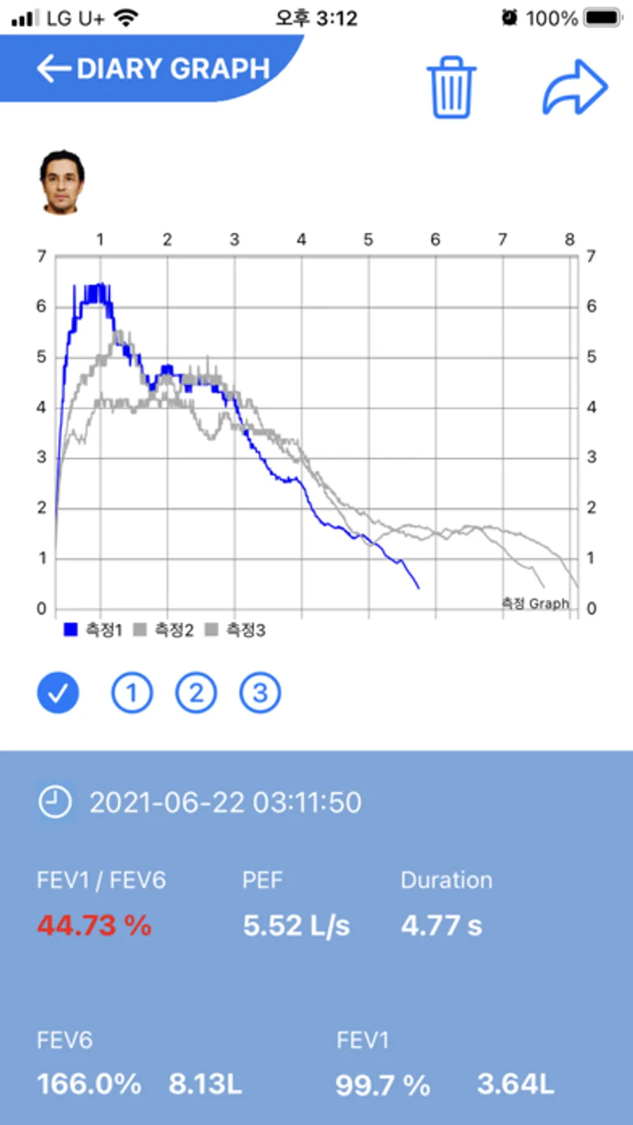 3) NUGA WIND(누가윈드)는 노력성 폐활량 FEV1 및 FEV6, 날짜/시간으로 폐활량 측정 기록을 추적하기 위한 것입니다.