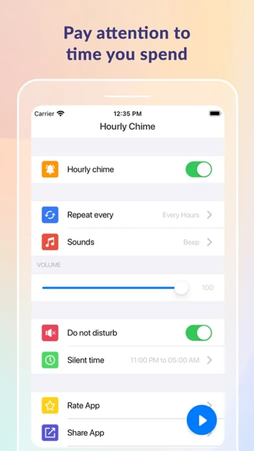Hourly Chime is an app which is there to help you to manage your time. App plays short sounds at preset intervals. Get yourself occupied in daunting tasks & quickly have an alert sound to bring attention towards passing time.