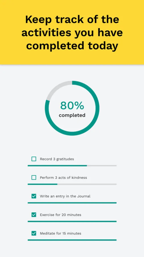 There are 5 daily tasks that the Well app asks you to complete each day: record 3 gratitudes, write a journal entry, perform 3 acts of kindness, exercise for 20 minutes, and meditate for 15 minutes.