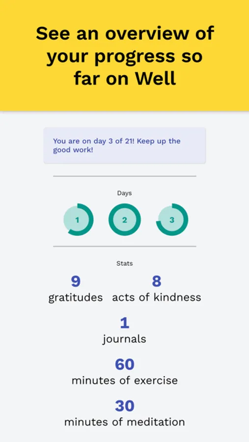 The Well app works best when its users use it continually for 21 days. Why 21 days? The inspiration behind this comes from positive psychology advocate Shawn Achor, whose work found that in only 21 days, you can rewire your brain to think more optimistically, which will increase your happiness and productivity.