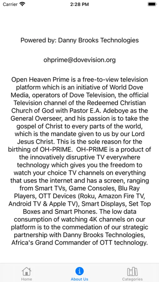 Open Heaven Prime is a free to view television platform which is an initiative of World Dove Media, operators of Dove Television, the official Television channel of the Redeemed Christian Church of God with Pastor E.A. Adeboye as the General Overseer, and his passion is to take the gospel of Christ to every parts of the world, which is the mandate given to us by our Lord Jesus Christ. This is the sole reason for the birthing of OH-PRIME.