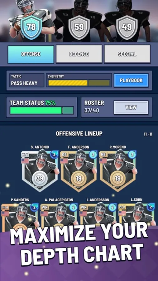 Build your franchise by scouting and drafting youth talent as well as trading for seasoned stars! If they don't give you top performances, send them to the transfer list! Looking for an up and coming Quarterback? Check out the awesome player pack offers in the Blitz store!