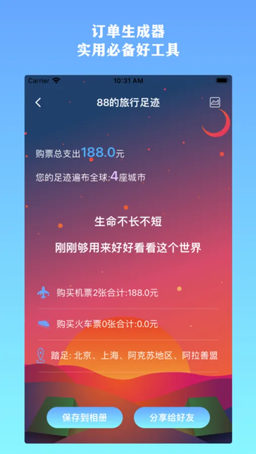 订单生成器是一款订单统计、订单生成、订单创建、旅行订单生成、车票订单生成、机票订单生成、酒店订单生成、出行订单生成的订单管理APP。