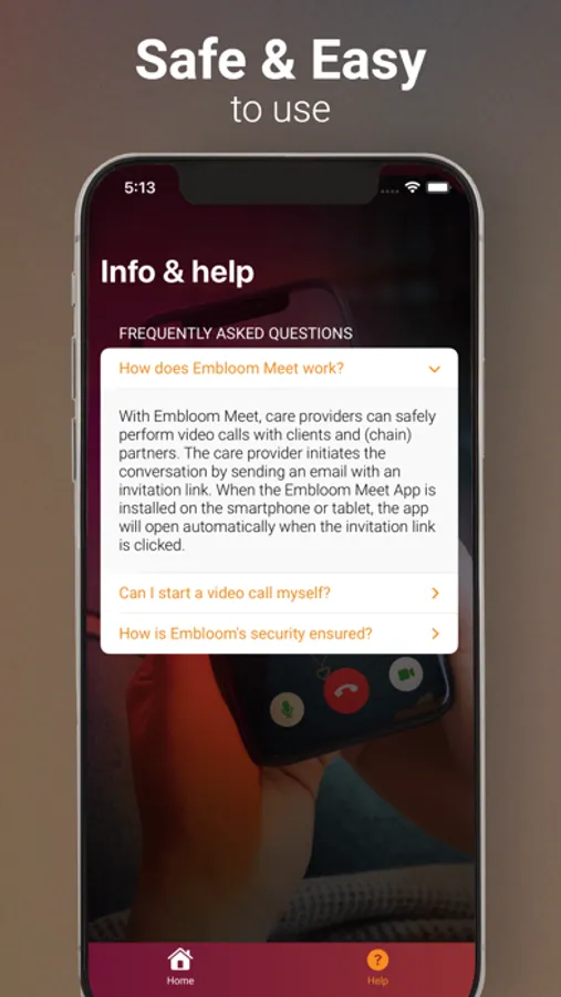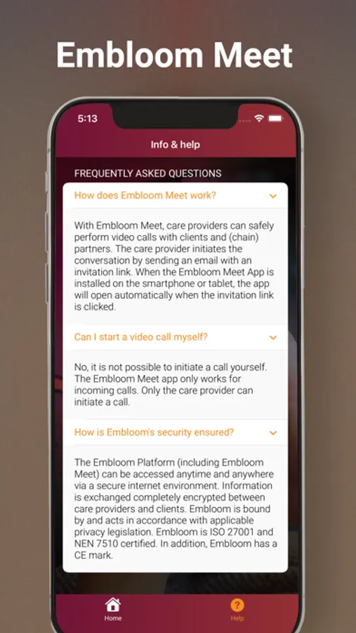 With the Embloom Meet app, video conferencing via the Embloom platform is also possible on mobile devices. Embloom Meet has been developed for video conferencing within the healthcare sector and is safe and easy to use.