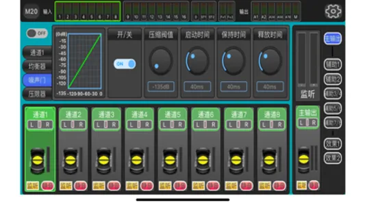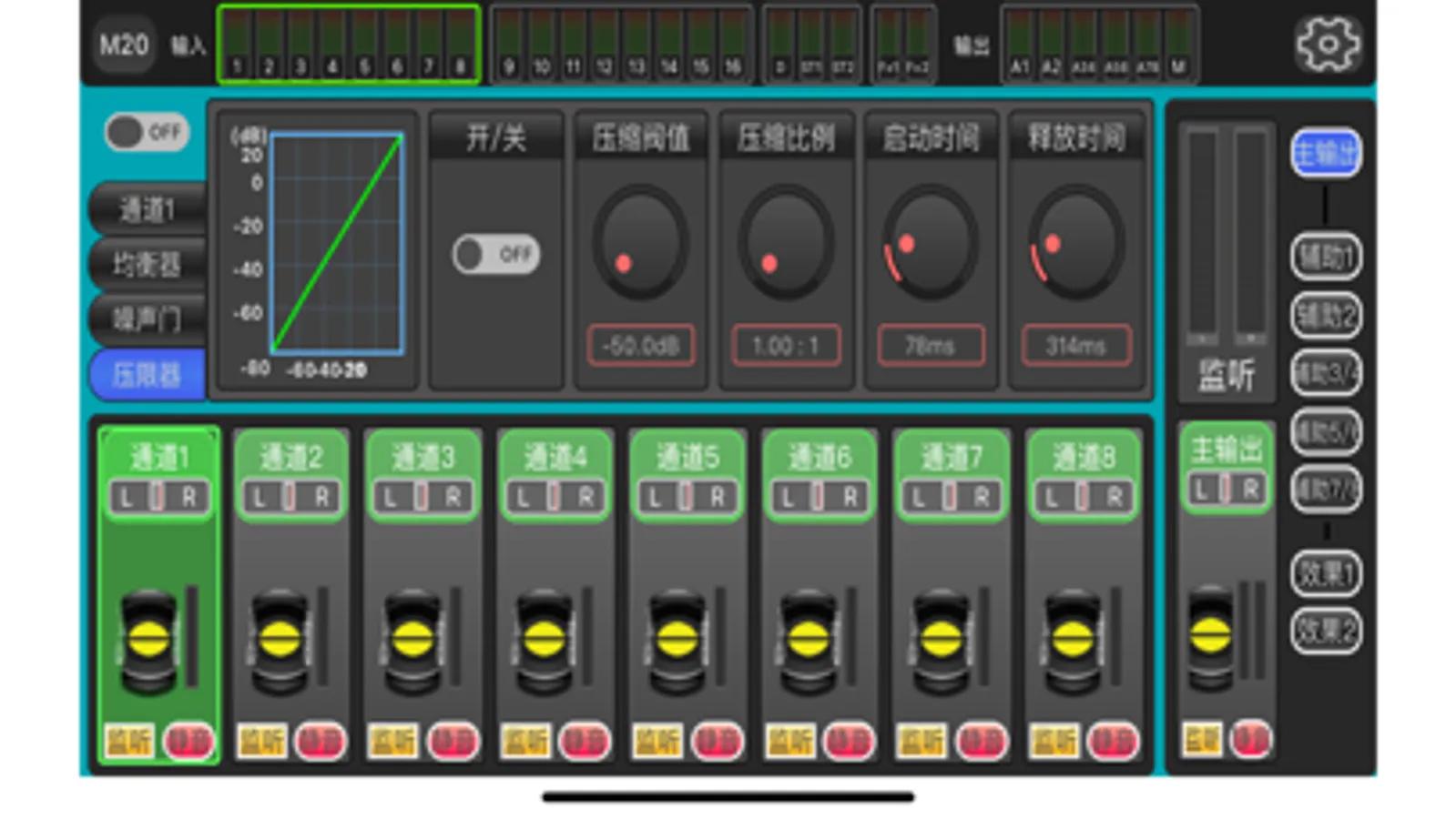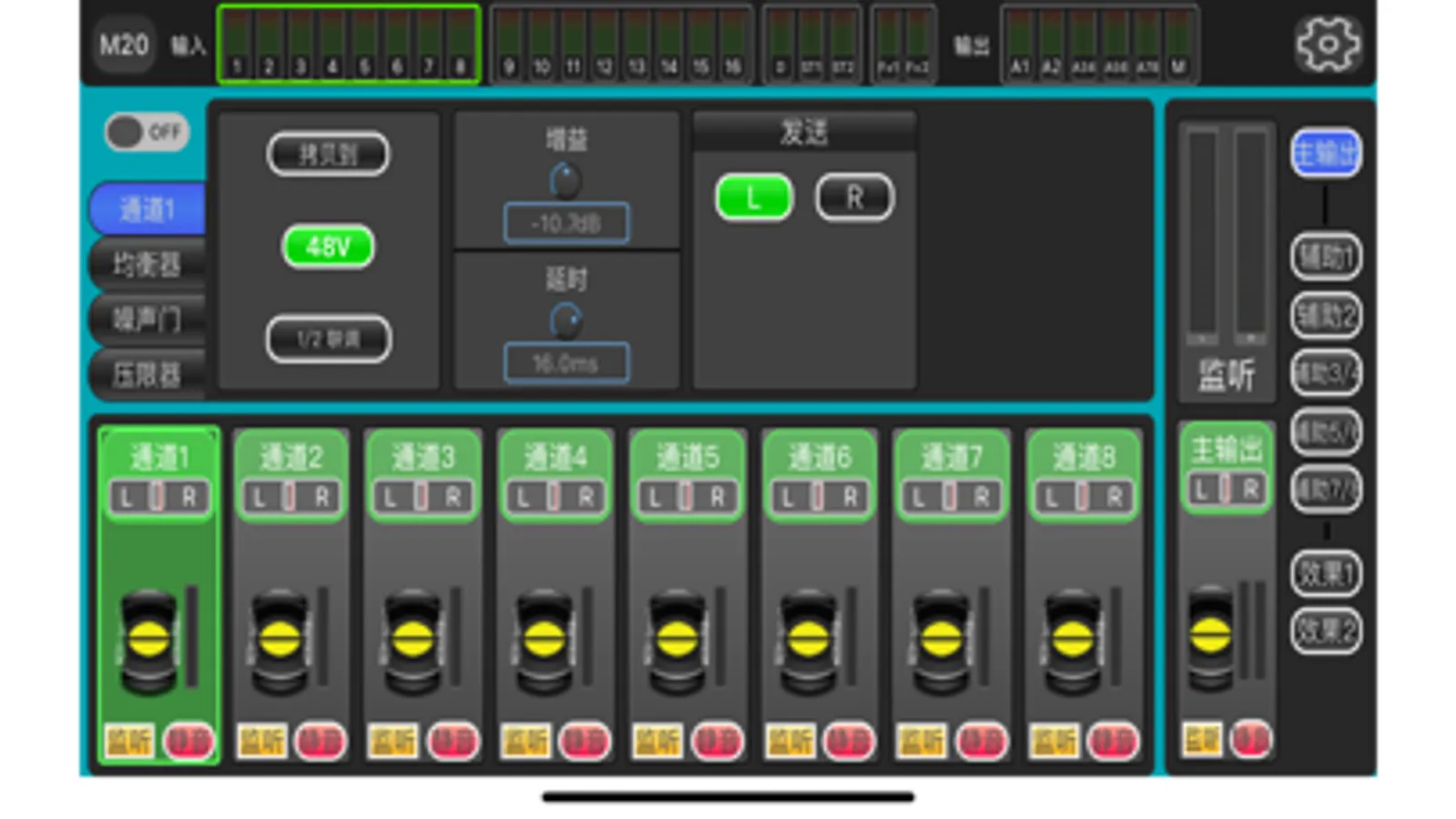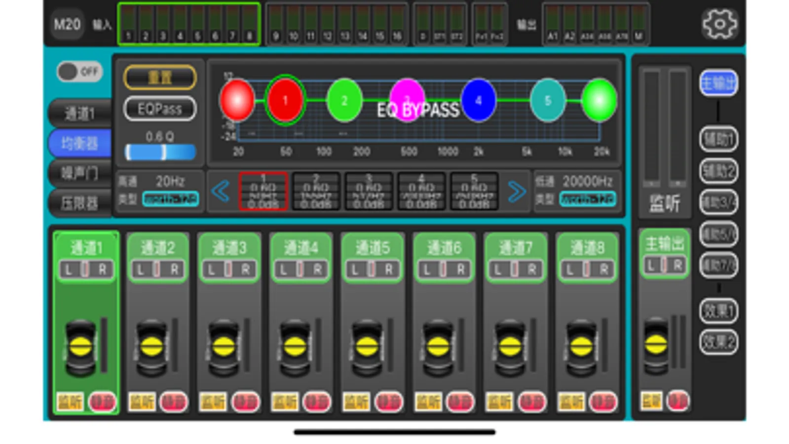 •・输出处理:高低通滤波,15段参量均衡(GEQ支持通过在推子上操控),压缩器,延时,相位