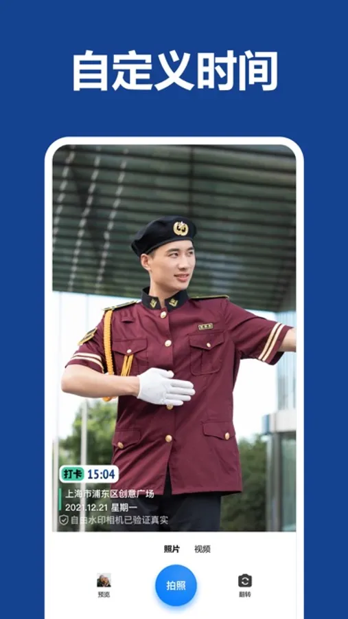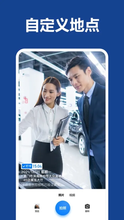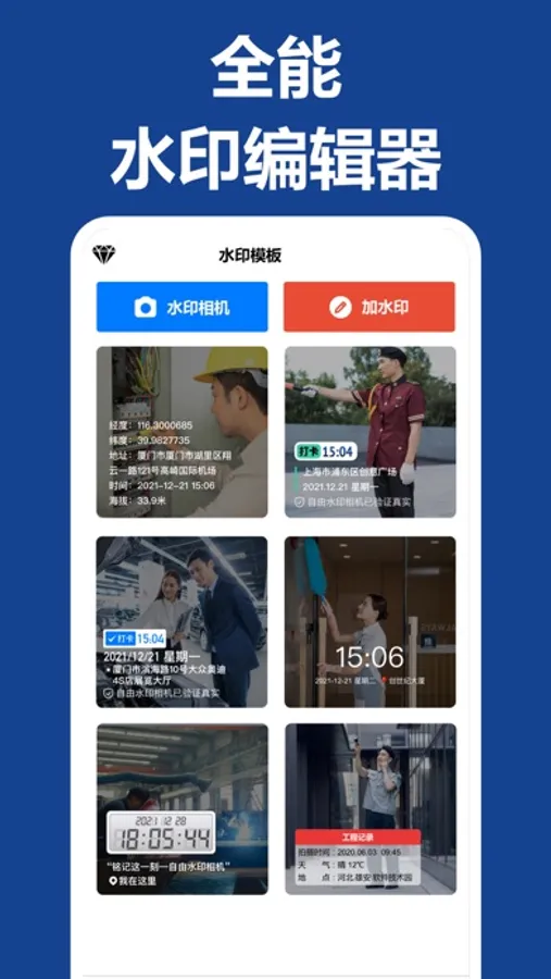 打卡水印相机是一款全能水印编辑器,拍照拍视频加水印,自定义时间和地点。