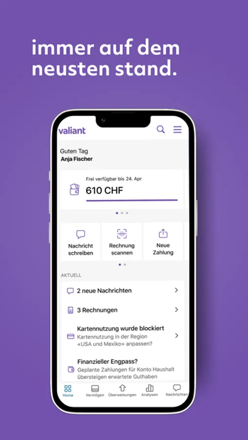 - Rechnungen bezahlen mit eBill oder QR-Rechnungen scannen und in der Valiant App freigeben