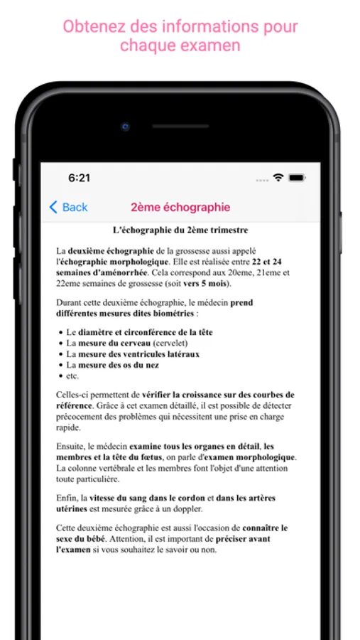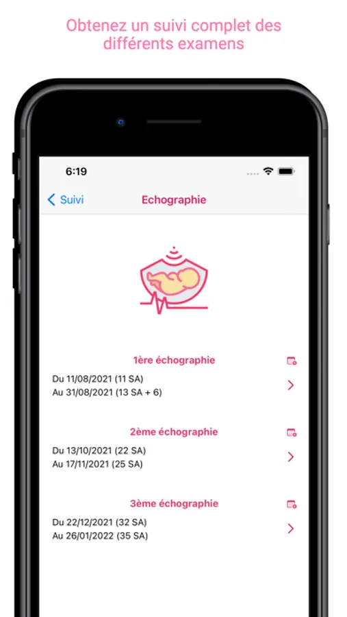 A l’aide de votre âge gestationnel calculé, obtenez un suivi complet (informations et dates précises) des différents examens à faire: