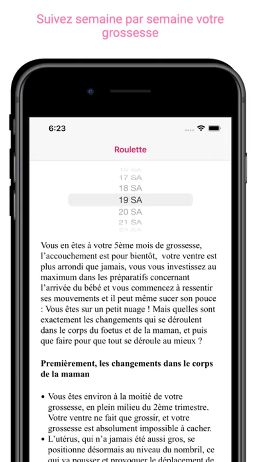 Votre calendrier gestationnel intègre également une roulette qui vous permettra, pour chaque nouvelle semaine d’aménorrhée, d’obtenir de nombreux conseils, informations et astuces afin de mieux appréhender votre grossesse.
