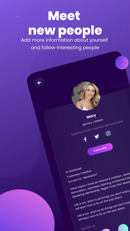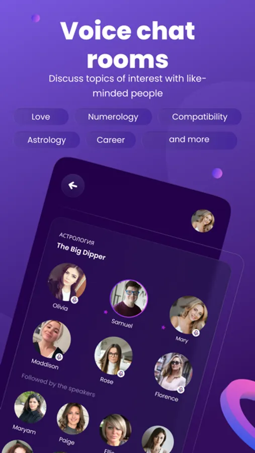 With our app you can chat in voice rooms. Discuss live live topics, questions, ideas, thoughts and principles that interest you. Everything about relationships, love, personal life and topics that are important to you.