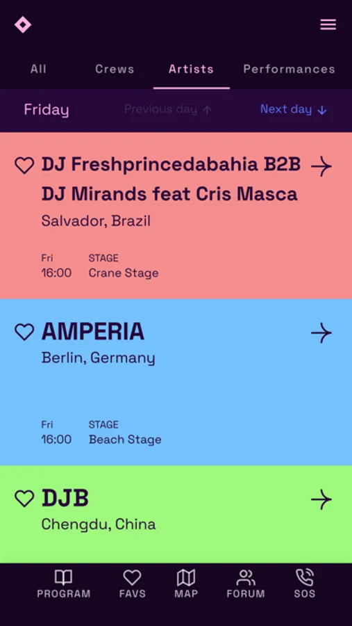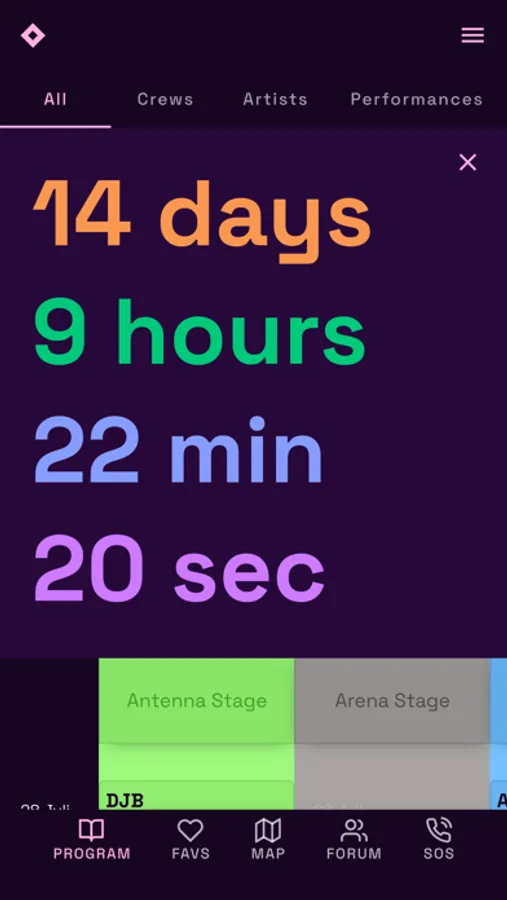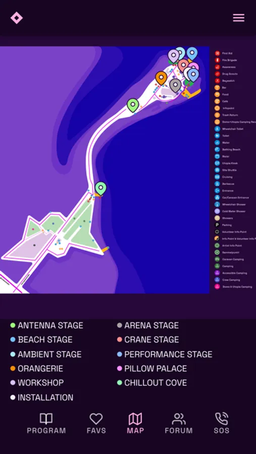 Find all the informations about the collectives, artists and activities, create your personalized schedule through the “favorites” function, locate the different areas on the map and talk to people on the forum.