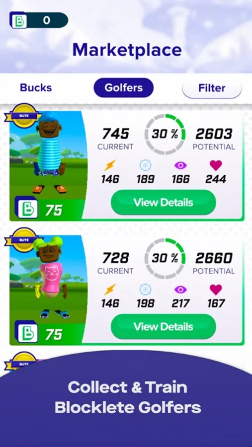 Blocklete Golf will test your digital golf and strategy skills! Compete in tournaments against other players, win and upgrade your golfers through your game play in fun and unique environments! Climb the leaderboards against players worldwide, get extra rewards, and one of a kind trophies for top place finishes. Treat your time and your golfers as real assets. Invest in your players and grow their stats to help you win amazing prizes and dominate our leaderboards!