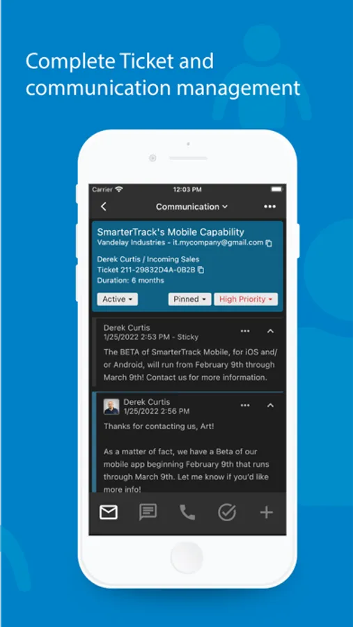 SmarterTrack Mobile complements the full web interface that's available to agents and managers using SmarterTrack, either on-premises or the SmarterTrack hosted service. It provides all the core functionality needed to provide high quality customer service and support when on-the-go.