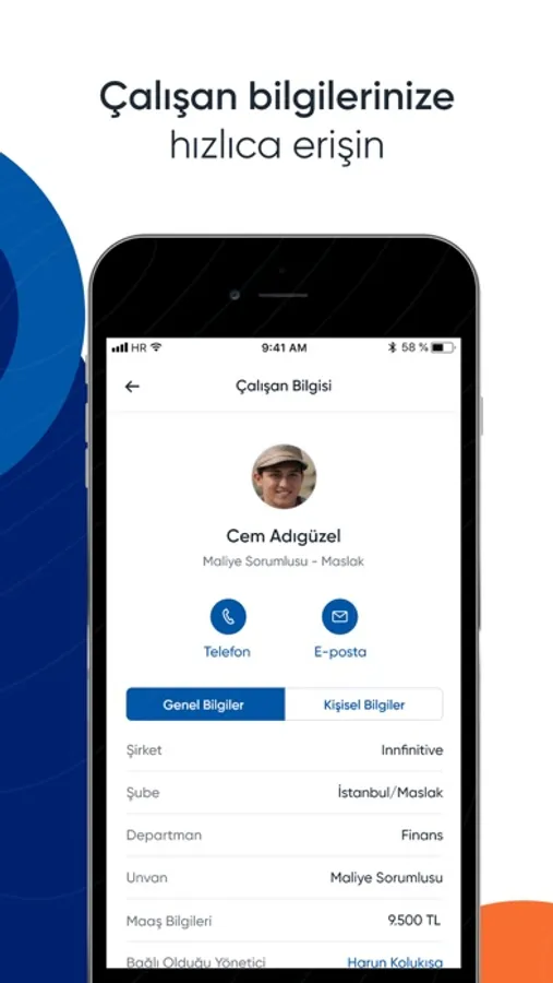 Organizasyonunda çalışan kişilerin telefon ve e-mail bilgilerini görüntüleyebilir, uygulama üzerinden arama başlatabilir ve mail gönderebilir.