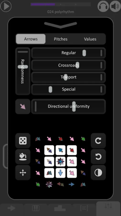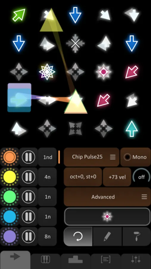Each arrow contains adjustable values such as pitch, note duration, volume, etc, while shapes can interpret these values in their own way. For instance, a shape can add an octave to each pitch it comes across, so it will play all the notes one octave higher.