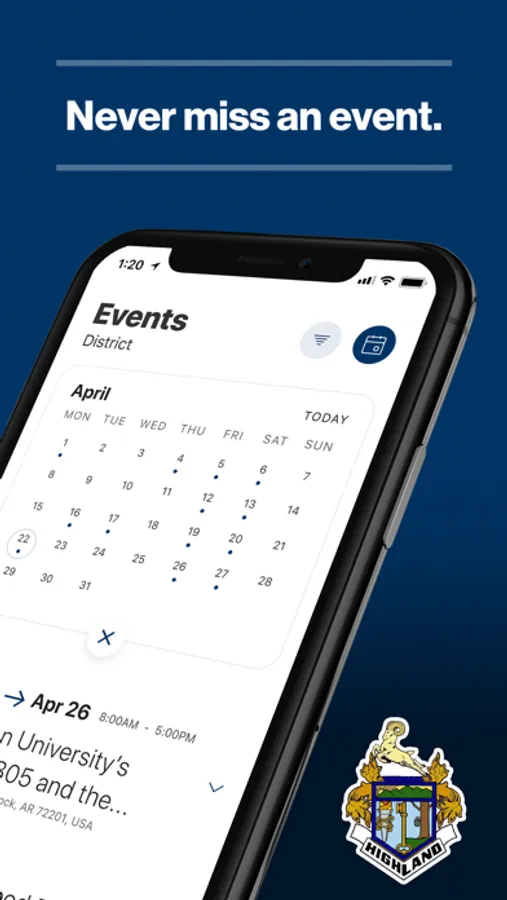 The event section shows a list of events throughout the district. Users can add an event to your calendar to share the event with friends and family with one tap.