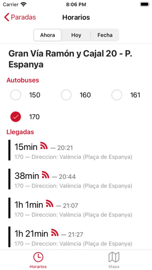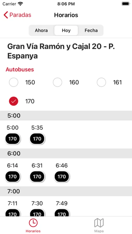 El usuario puede seleccionar los horarios actuales sobre una parada o los programados para el día, también puede seleccionar los horarios de un día en concreto sobre un calendario