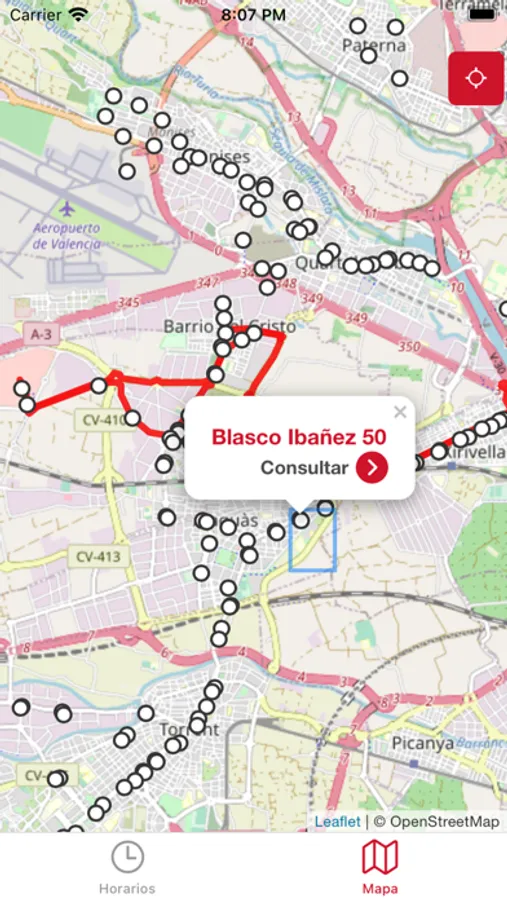 La aplicación dispone de un plano donde se muestran las líneas y paradas seleccionadas. Al pulsar sobre una parada ofrecerá los tiempos de espera reales y actualizados.