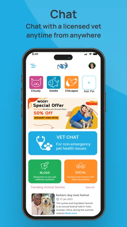 PetMyPal is more than a vet chat app, way more. Built on social media foundation, you can connect with other pet parents and ask them questions, create or join local and virtual pet communities, share pictures and videos of lovable pets with other pet parents and read vet-written content to help improve your pet's health, all completely free to you. Try it and let us know what else we can do to make it an even better app for pet parents like us by sending your thoughts at info@petmypal.com