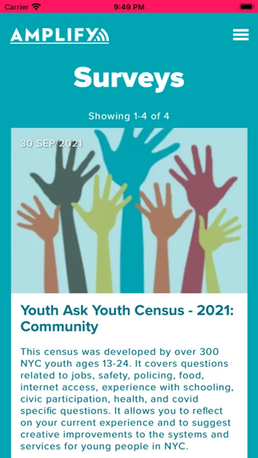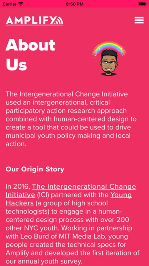 In 2016, The Intergenerational Change Initiative (ICI) partnered with the Young Hackers (a group of high school technologists) to engage in a human-centered design process with over 200 other NYC youth. Working in partnership with Leo Burd of MIT Media Lab, young people created the technical specs for Amplify and developed the first iteration of our annual youth survey.