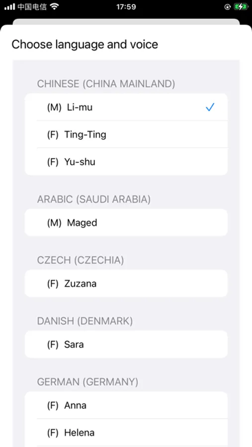 Conversion to speech is supported for text in these languages: English (US), English (UK), English (Australia), English (Ireland), English (South Africa), Spanish (Mexico), Spanish (Spain), French (France), French (Canada), German, Italian, Japanese, Korean, Mandarin (China mainland), Mandarin (Taiwan), Cantonese (Hong Kong), Arabic, Czech, Danish, Dutch, Finnish, Flemish (Belgium), Greek, Hebrew, Hindi, Hungarian, Indonesian, Norwegian, Polish, Portuguese, Portuguese (Brazil), Romanian, Russian, Slovak, Swedish, Thai, Turkish.