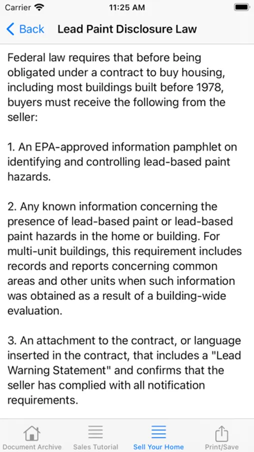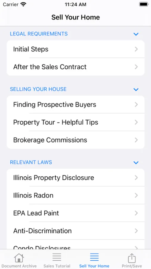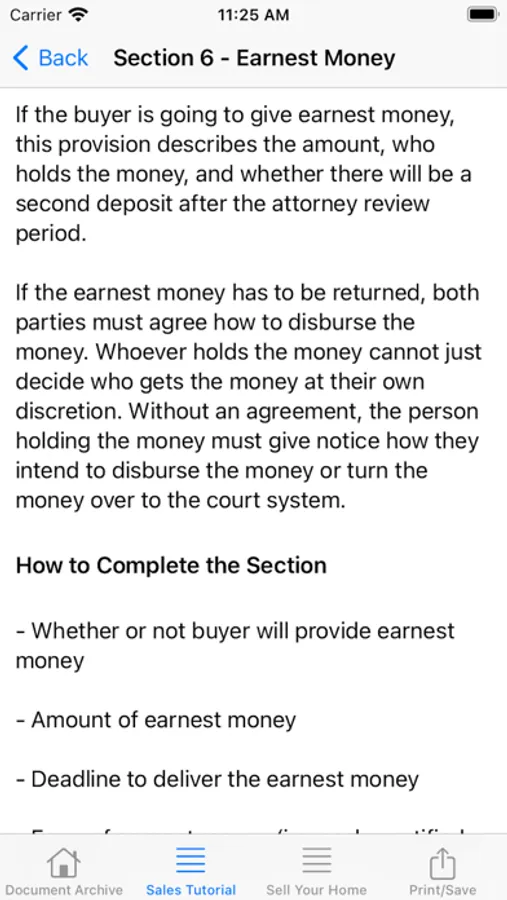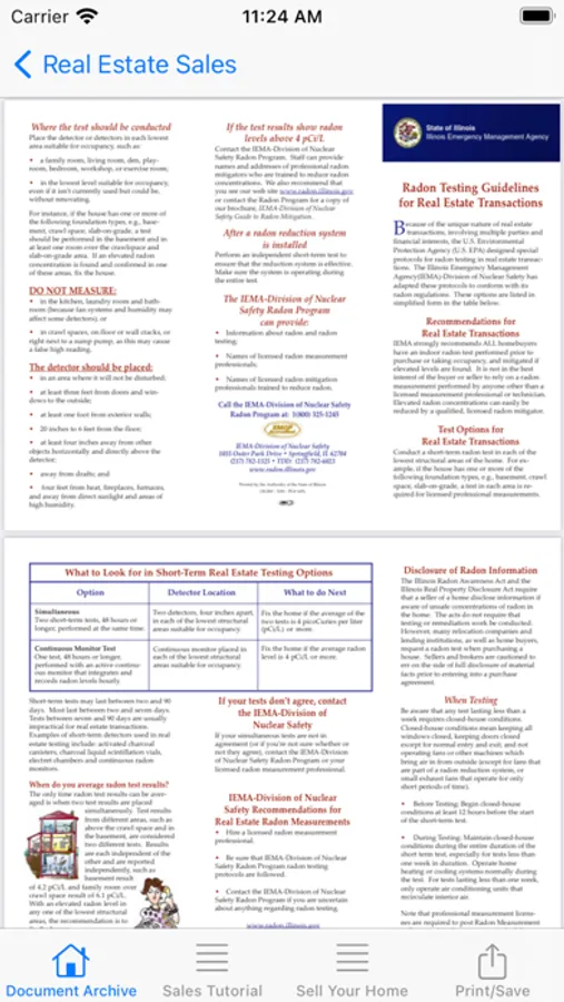 iOS Version: The app has four screens (tabs) to flip between content. The first is a document archive. The second is a complete tutorial for the documents. The third provides an explanation with helpful tips to guide the user through the transaction from start to finish. The fourth allows the user to print or save the files.