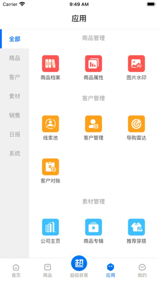 进销存、商城、营销素材、导购雷达、财务对账、选货平台、企业微官网、RFID管理、企业互联等模块一站式解决方案,让您告别信息孤岛问题