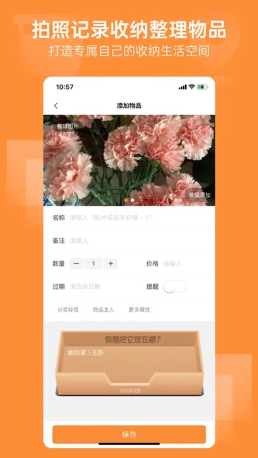 你可以记录物品的图片、名称、品牌、数量、生产日期、保质期、保修期、存放位置、备注、标签等。按类记录物品并添加附属标签,方便找寻及回忆。