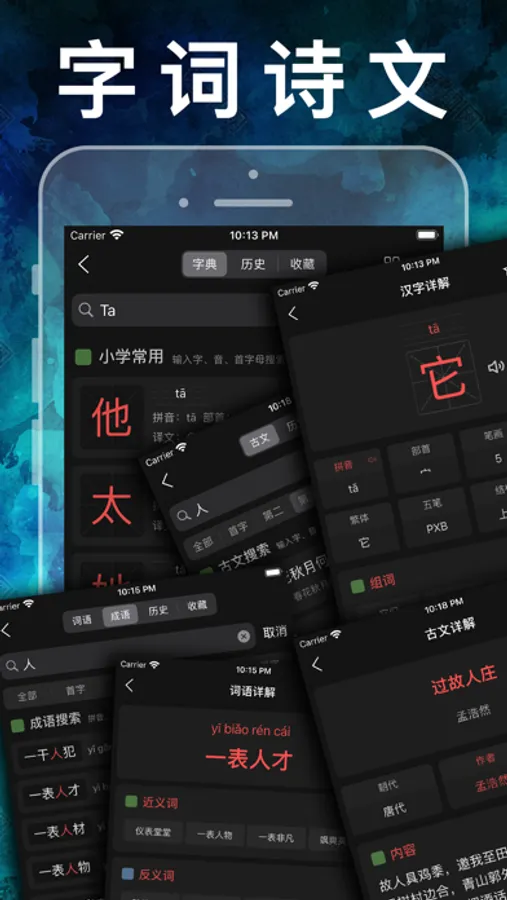 3、汉语字典、拼音、笔画、边旁部首搜索功能;