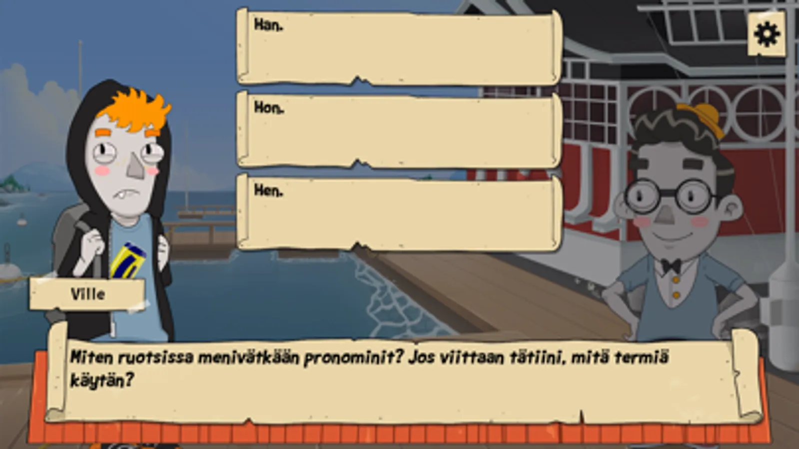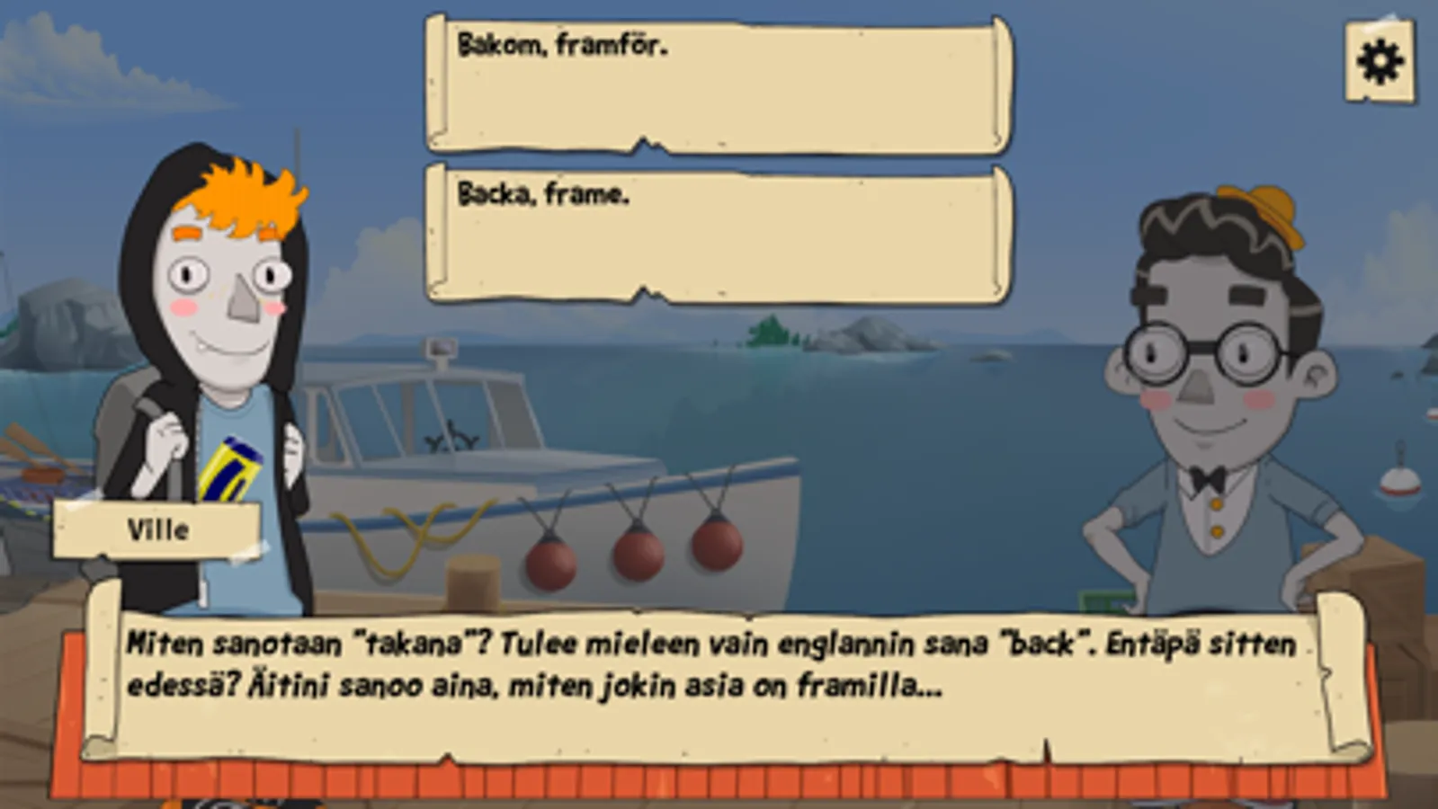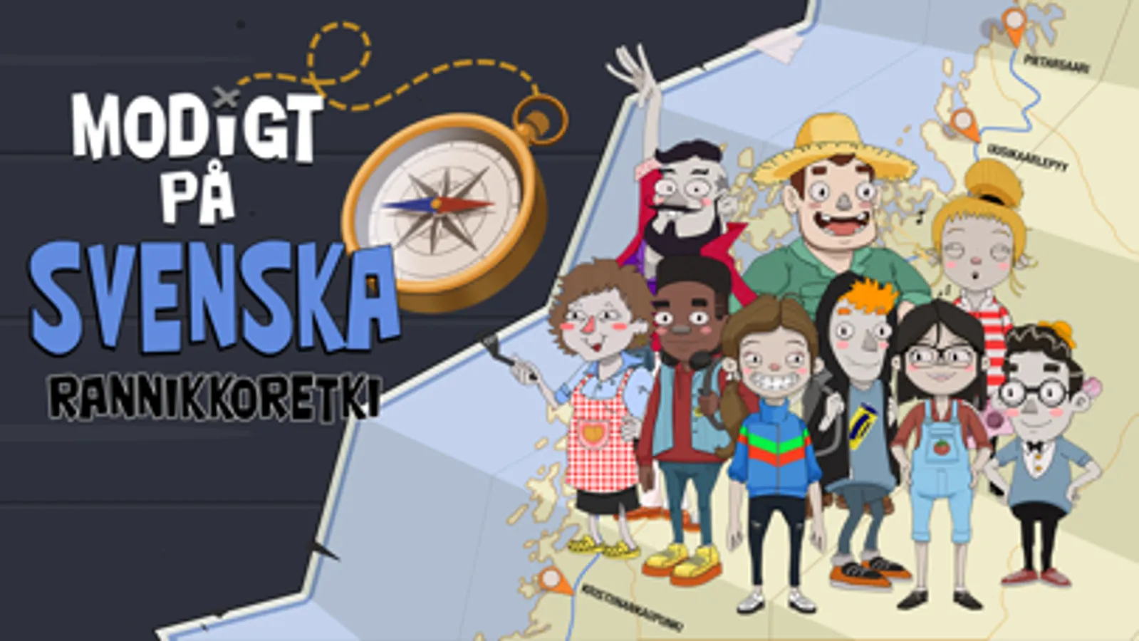 Modigt på svenska on iloinen visuaalinen novelli ja seikkailu, jossa on värikkäitä ihmisiä, kauniita paikkoja ja keskusteluun upotettuja aivopähkinöitä. Peli etenee kohtauksesta ja keskustelusta toiseen hyvän tarinan tapaan, mutta sinä päätät mitä vastaat ja minne tarina etenee seuraavaksi. Päähenkilö Ville on mysteeritarinoiden suuri ystävä ja innokas amatöörietsivä. Toinen päähenkilö Minttu taas on itsenäinen oman tiensä kulkija, joka lähtee rohkeasti mopolla seikkailuun. He tarvitsevat kuitenkin sinun nokkeluuttasi, jotta eivät eksy reitiltä, eikä kieli mene solmuun pelin värikkään henkilökaartin edessä.