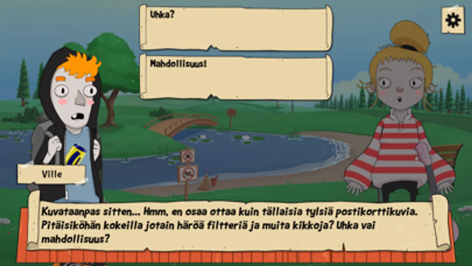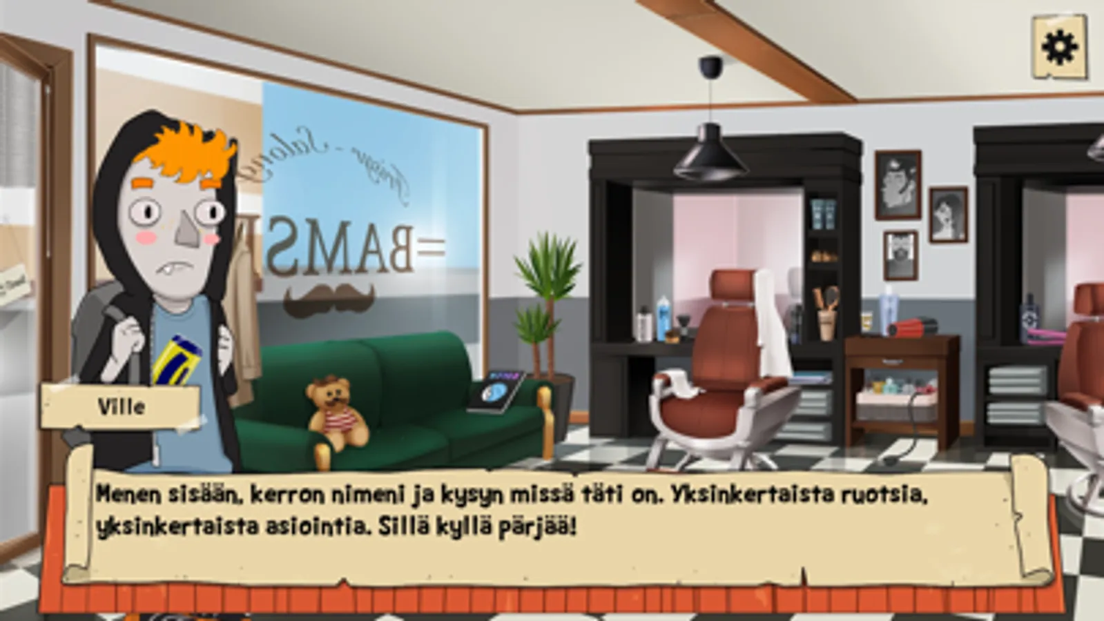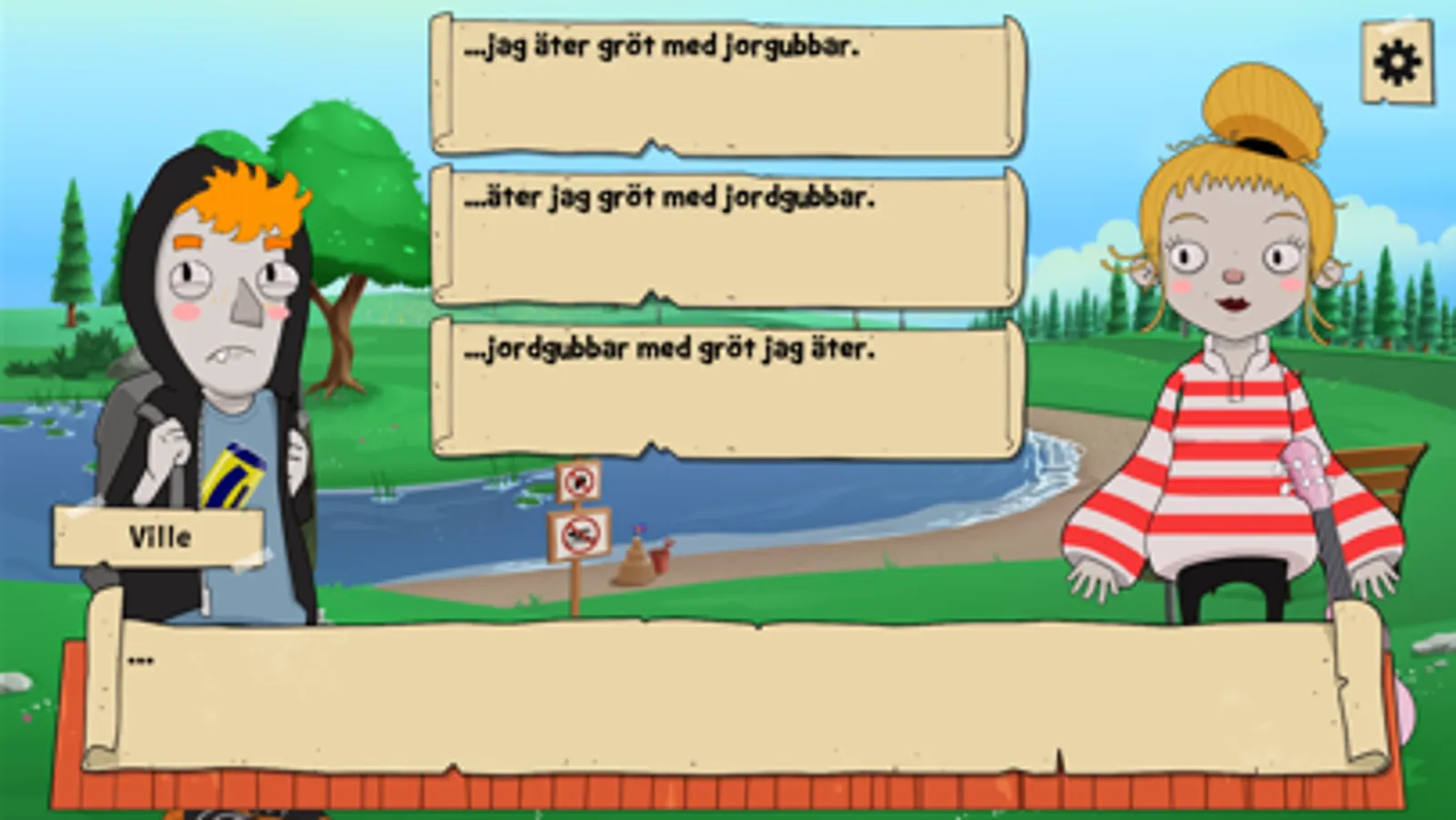 Modigt på svenska on iloinen visuaalinen novelli ja seikkailu, jossa on värikkäitä ihmisiä, kauniita paikkoja ja keskusteluun upotettuja aivopähkinöitä. Peli etenee kohtauksesta ja keskustelusta toiseen hyvän tarinan tapaan, mutta sinä päätät mitä vastaat ja minne tarina etenee seuraavaksi. Päähenkilö Ville on mysteeritarinoiden suuri ystävä ja innokas amatöörietsivä. Toinen päähenkilö Minttu taas on itsenäinen oman tiensä kulkija, joka lähtee rohkeasti mopolla seikkailuun. He tarvitsevat kuitenkin sinun nokkeluuttasi, jotta eivät eksy reitiltä, eikä kieli mene solmuun pelin värikkään henkilökaartin edessä.