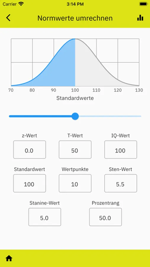 • Automatische Umrechnung eines Normwertes in andere gebräuchliche Normwerte (z. B. T-Werte, IQ-Werte, Stanine-Werte, Prozentränge) und die grafische Veranschaulichung des individuellen Testergebnisses anhand der Position in einer Normalverteilungskurve.