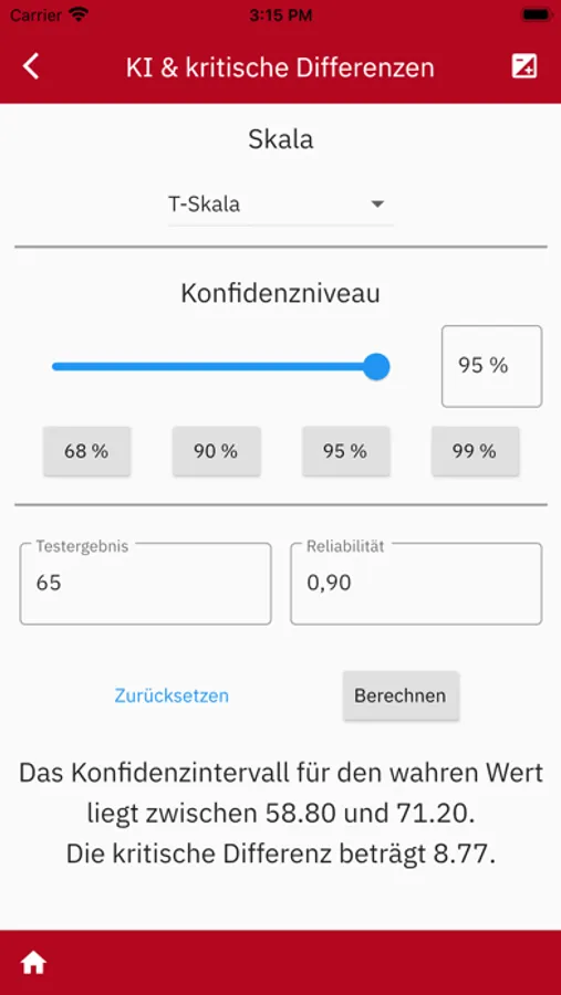 • Berechnung von Konfidenzintervallen und kritischen Differenzen unter Berücksichtigung der gewählten Normwertskala auf Grundlage des eingegebenen individuellen Testergebnisses, der Reliabilität des eingesetzten Testverfahrens sowie des gewählten Konfidenzniveaus.