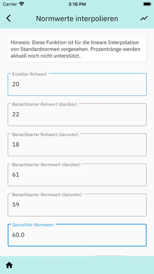 • Berechnung von Normwerten für individuelle Testergebnisse, die zwischen zwei in den Normtabellen angegebenen Rohwerten liegen und nicht tabelliert sind, mithilfe linearer Interpolation.